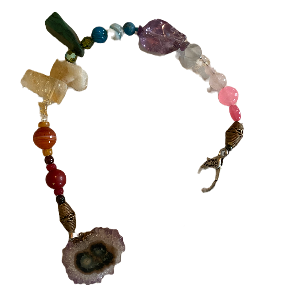 Spiritual protection, insight, and connection to higher consciousness. This Vastu creates a full chakra alignment, beginning from the grounding red jasper and carnelian (Root & Sacral chakras) and rising through the heart, throat, and third eye up to the crown with amethyst and quartz. It’s a piece for balance, transformation, and harmony between the physical and spiritual.